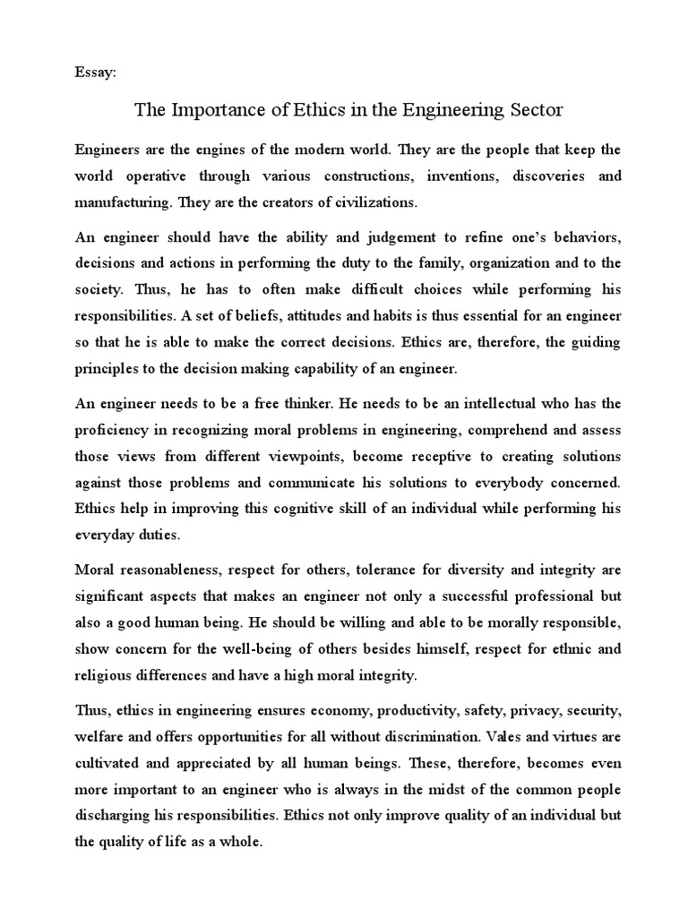 Ethics in Engineering The major reason why ethics is an important part of engineering is because it helps to enact safety measures. Humanity relies on engineering for transportation, production of food materials, consumer electronics and many more things. Virtually, engineers design and create all human made things in the world · This is directly and explicitly observable in the Institution of Engineers of Australia Code of Ethics (), which lists working "in conformity with accepted engineering and environmental standards" as a basic ethical tenet of all engineering, and as the primary goal of environmental engineering is to create and uphold these environmental standards it can be Engineering Ethics Essay Engineering plays an important role in our society because it is a profession responsible for creating a sustainable in terms of developing our community. Construction of facilities is one of the main issues that are currently being managed by engineering professionals as a way to ensure that the credibility of services as well as